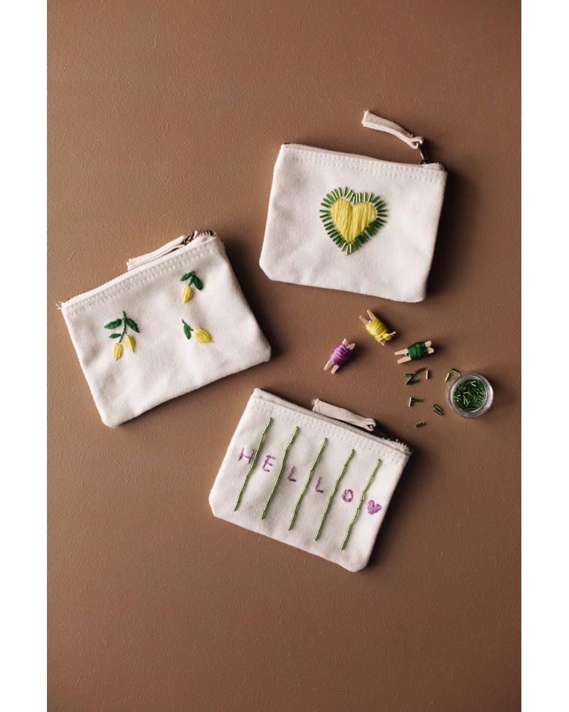Vous personnaliserez 3 petites pochettes en coton grâce aux fils et perles fournis : vous pourrez suivre les motifs fournis ou décider de créer les vôtres !